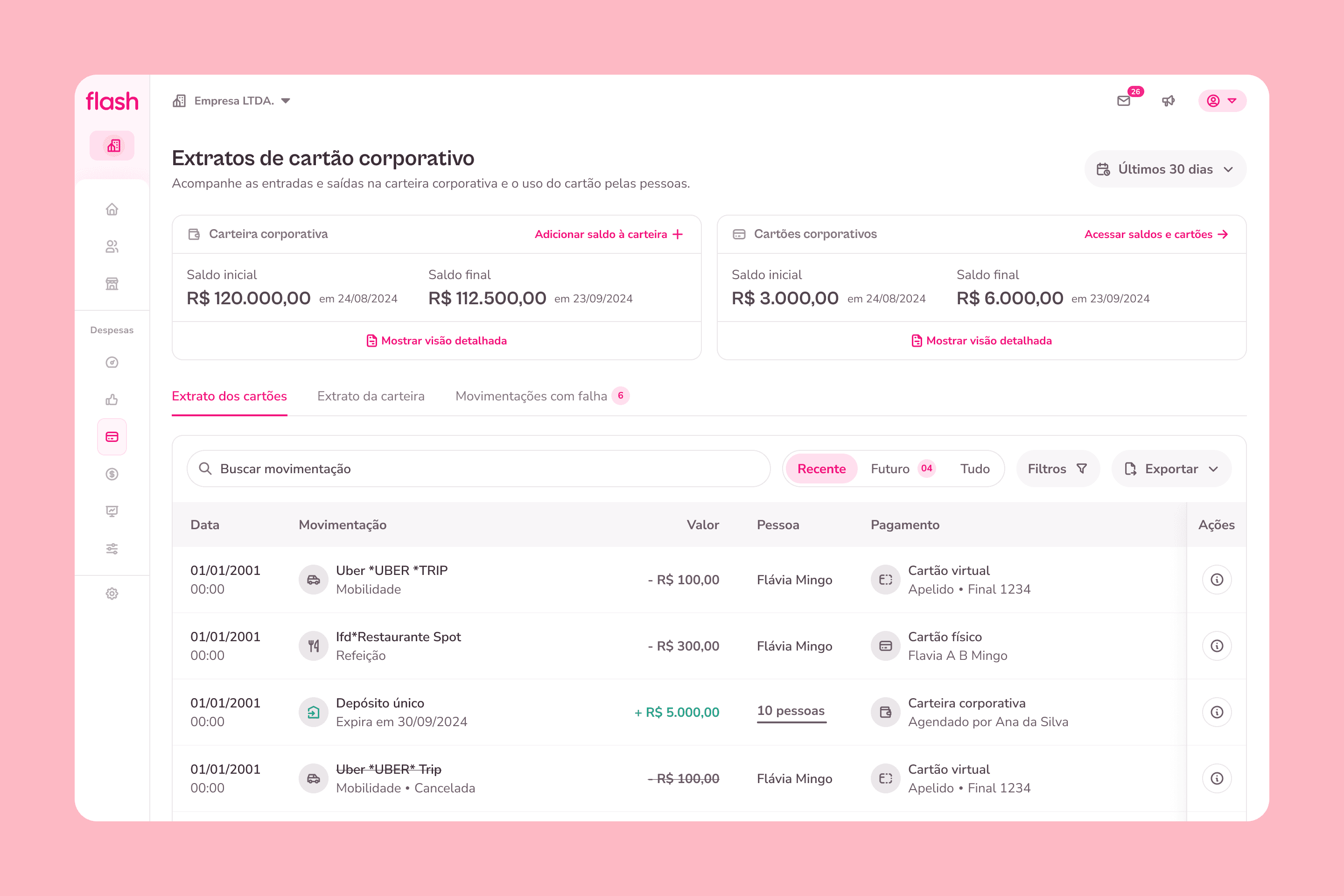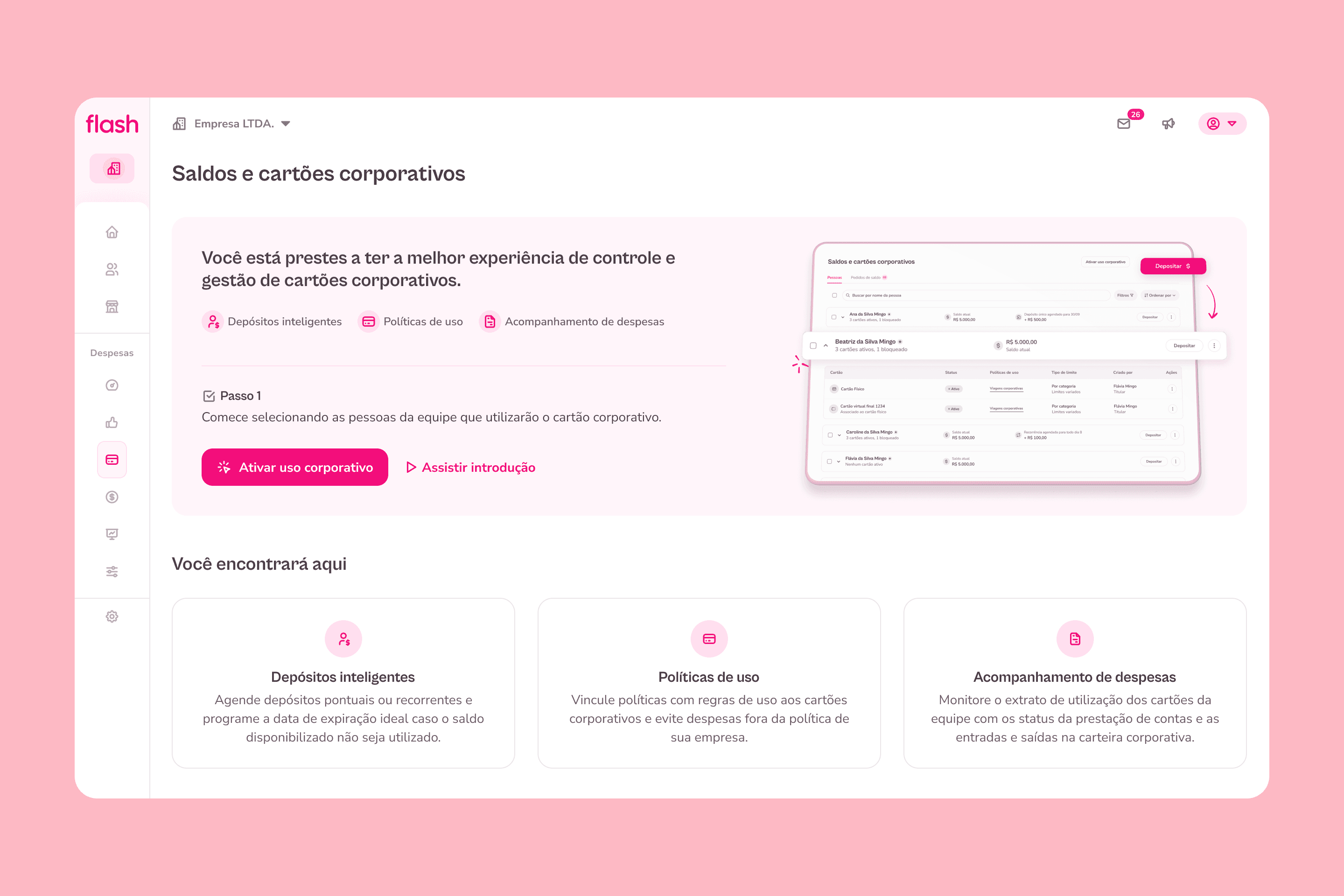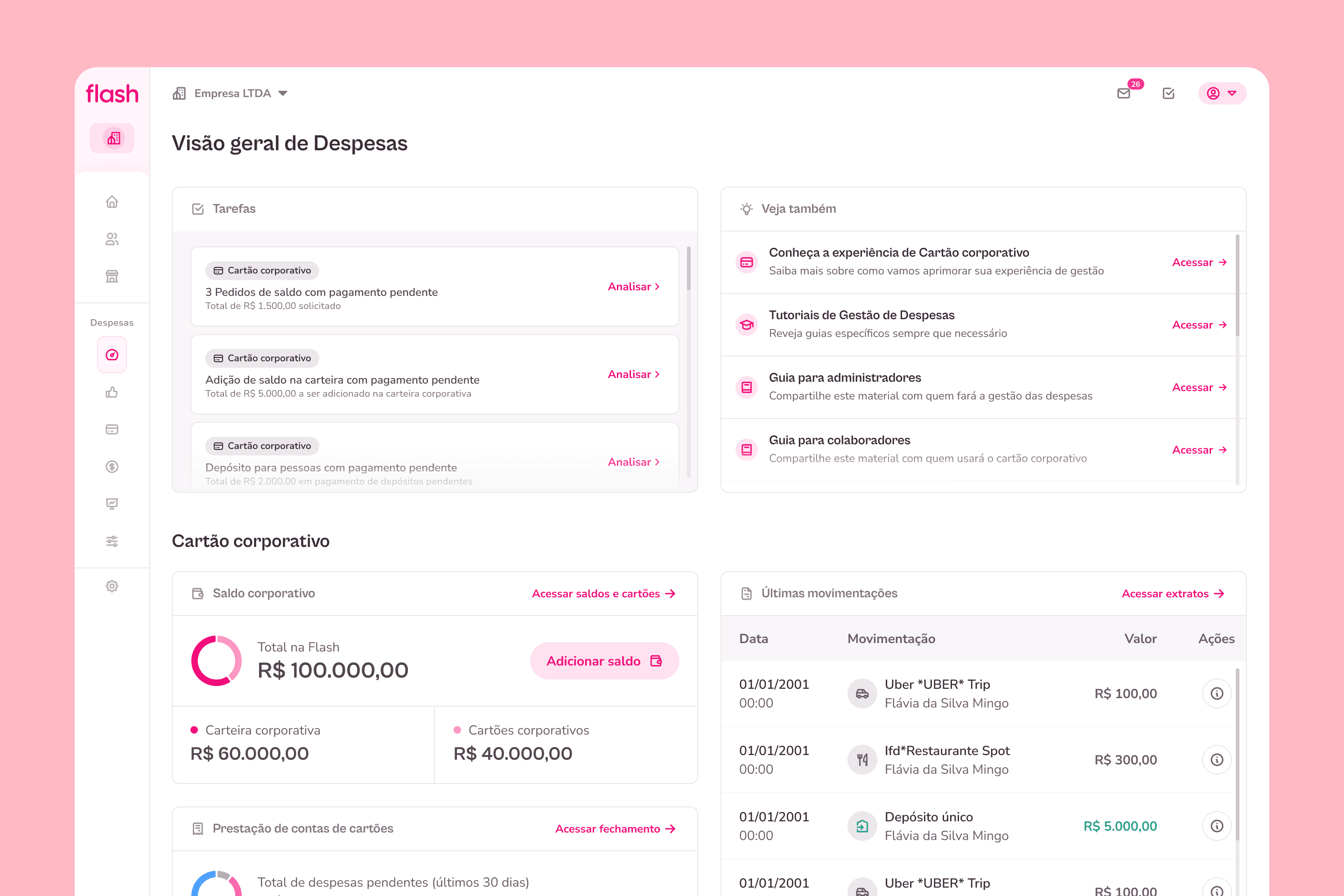A Flash tem uma solução de cartão corporativo pré-pago para gestão de despesas das empresas. Administradores são responsáveis por selecionar quem vai usar o cartão, gerenciar saldos, acompanhar transações e consolidar prestações de contas para fechamento contábil.