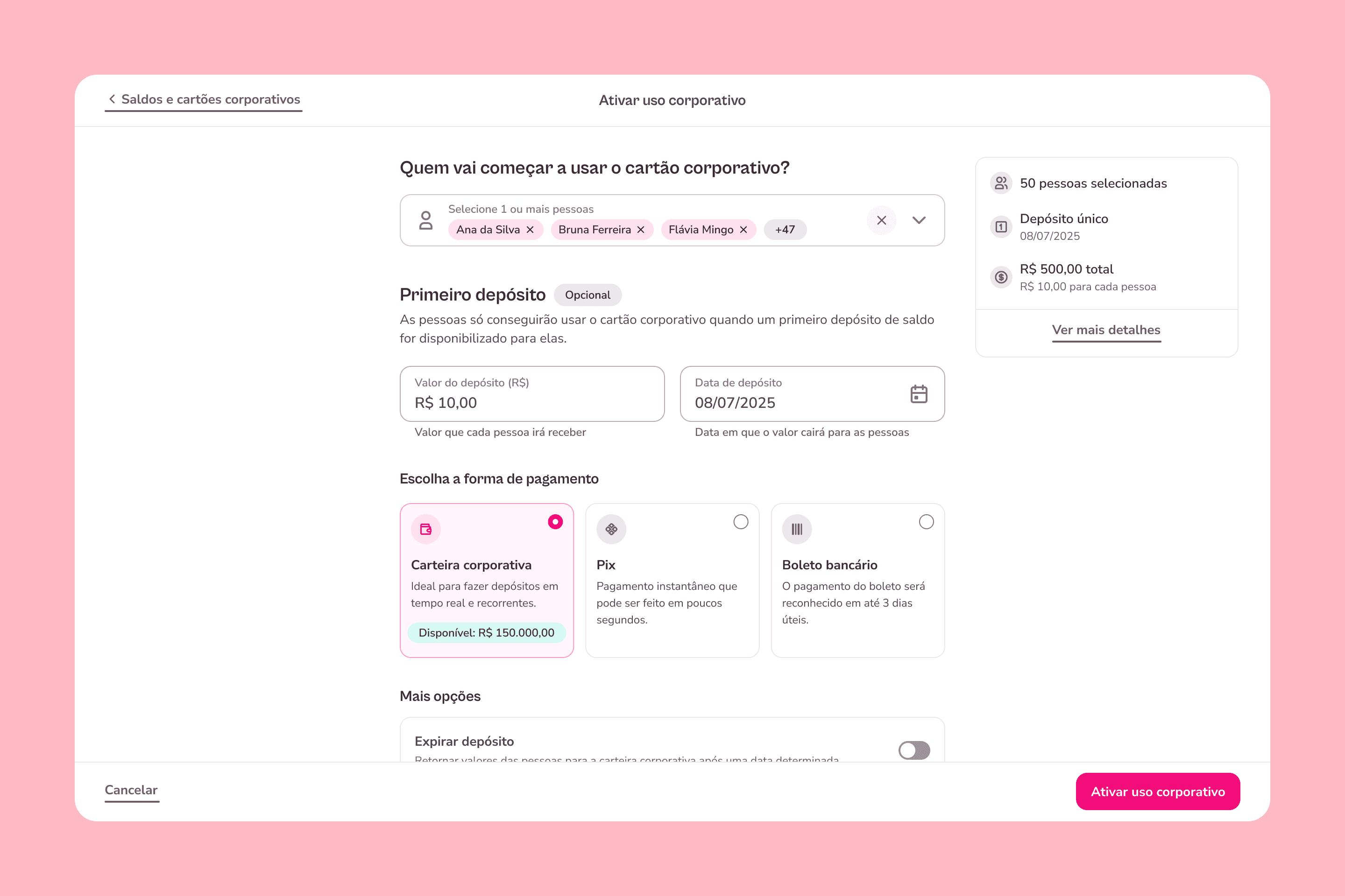 Criei um fluxo único que permite selecionar múltiplas pessoas e fazer o primeiro depósito no mesmo lugar, encurtando o caminho até o início de uso para novas empresas.