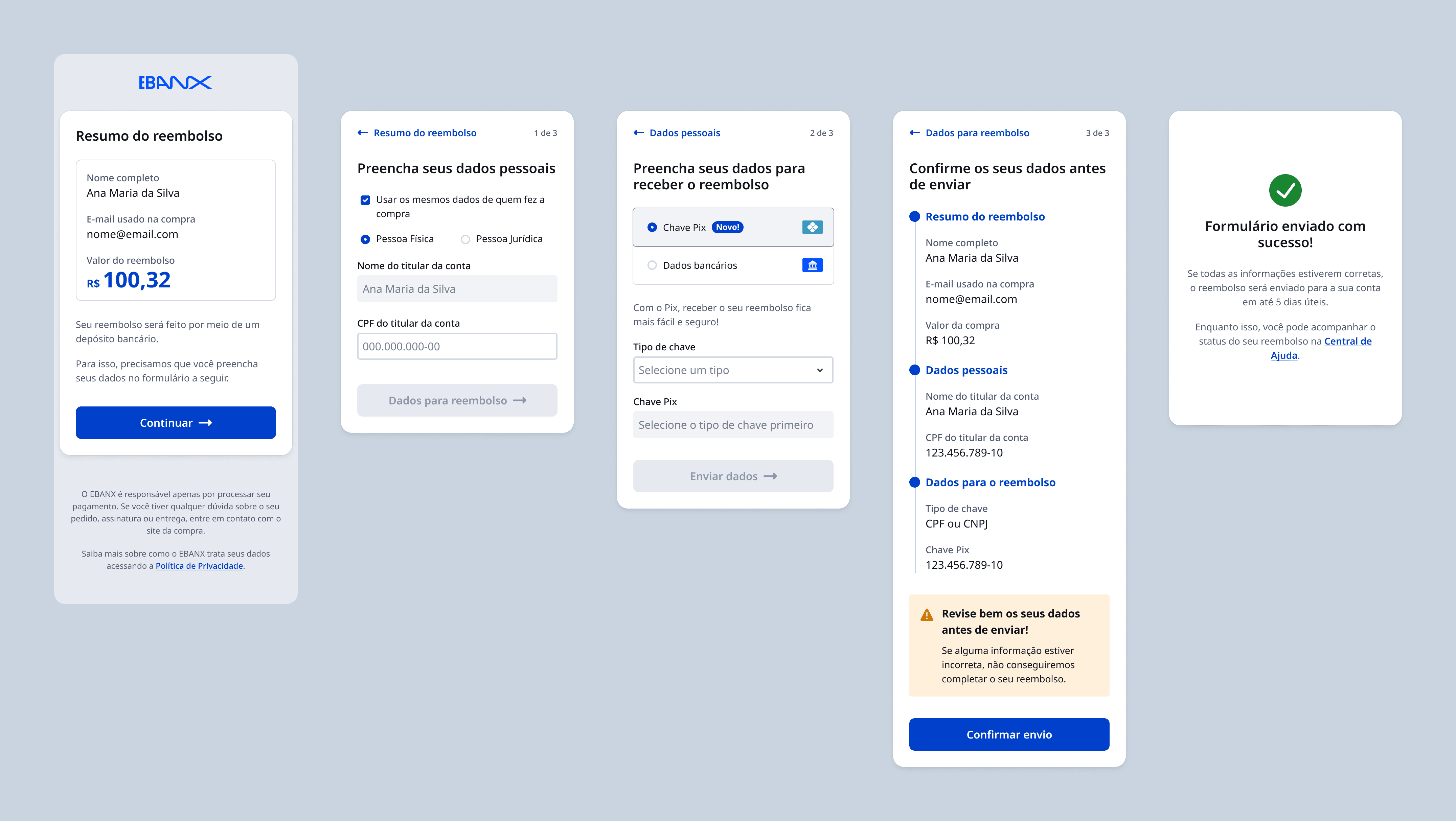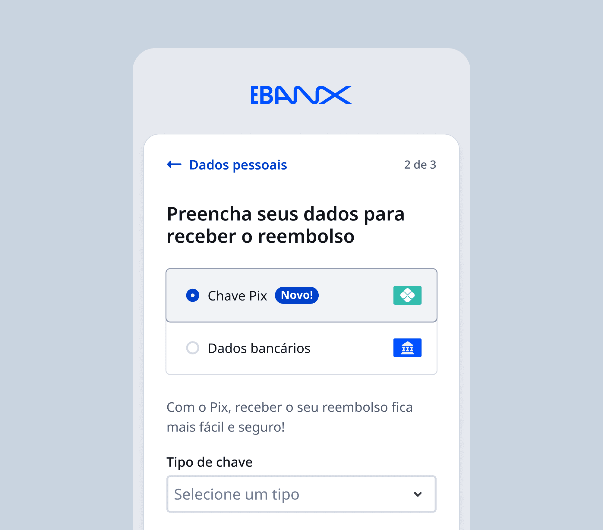 Em compras feitas com métodos de pagamento à vista, como boleto bancário, o reembolso nem sempre pode ser feito pelo método original. Nesses casos, o EBANX devolve o valor por depósito bancário, solicitado por meio de um formulário que deve ser preenchido pelo consumidor.