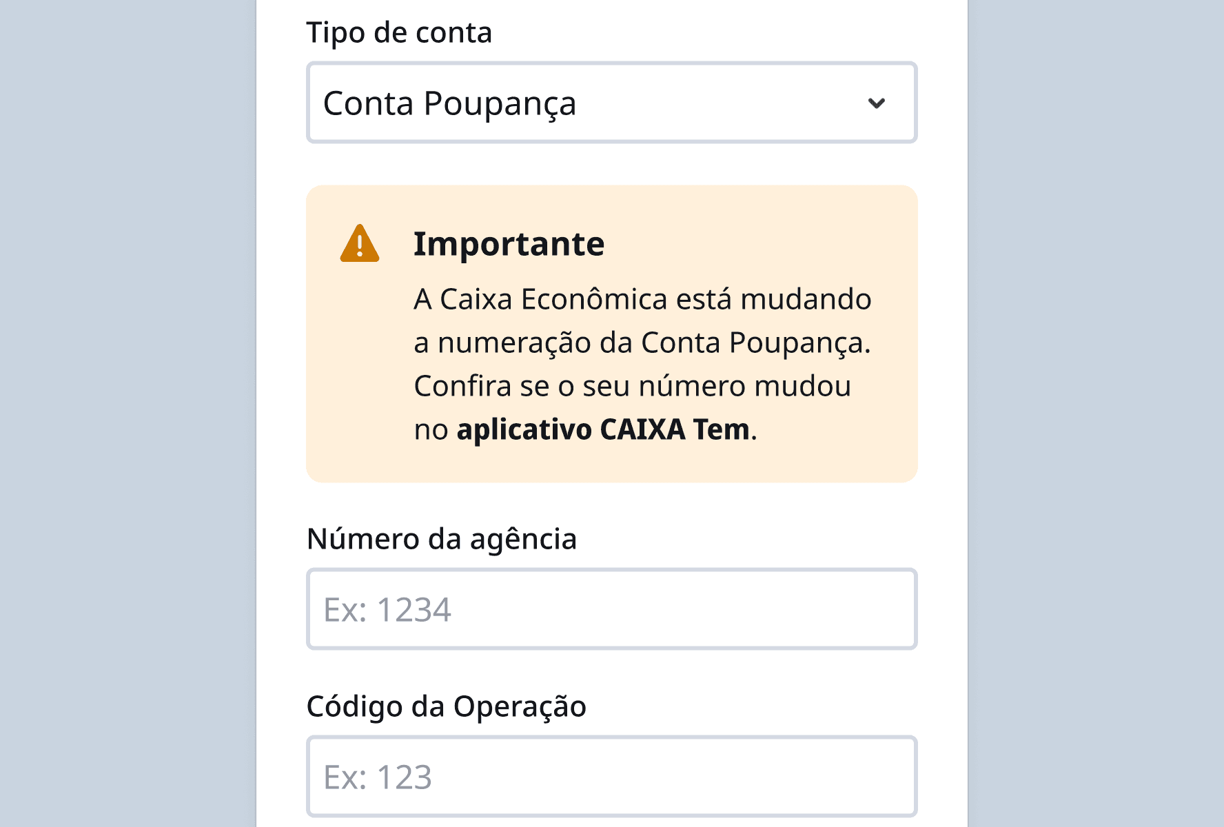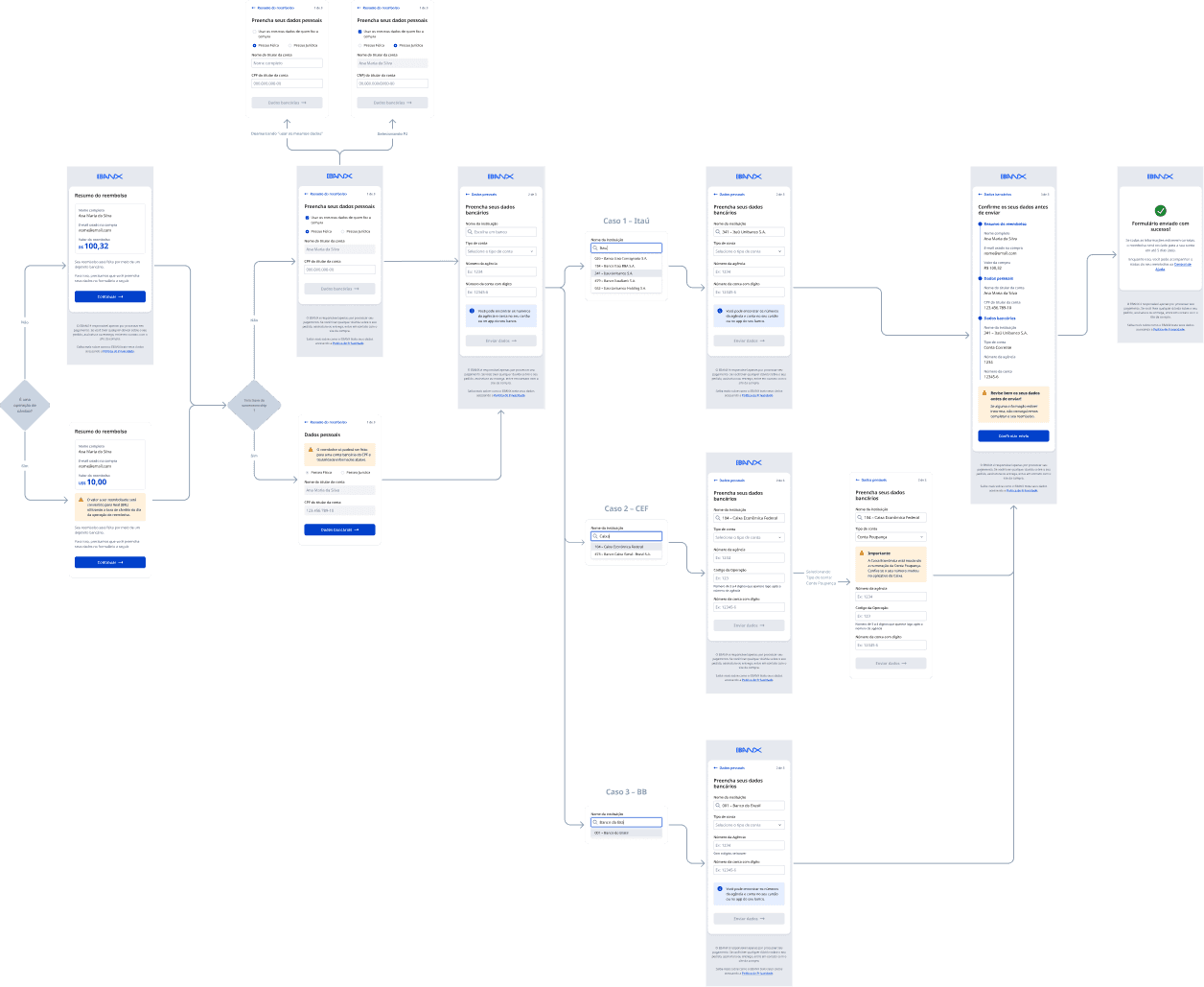 Redesenhei o formulário em etapas menores com validações em tempo real, instruções contextuais e retorno visual imediato para guiar o preenchimento correto dos dados bancários.